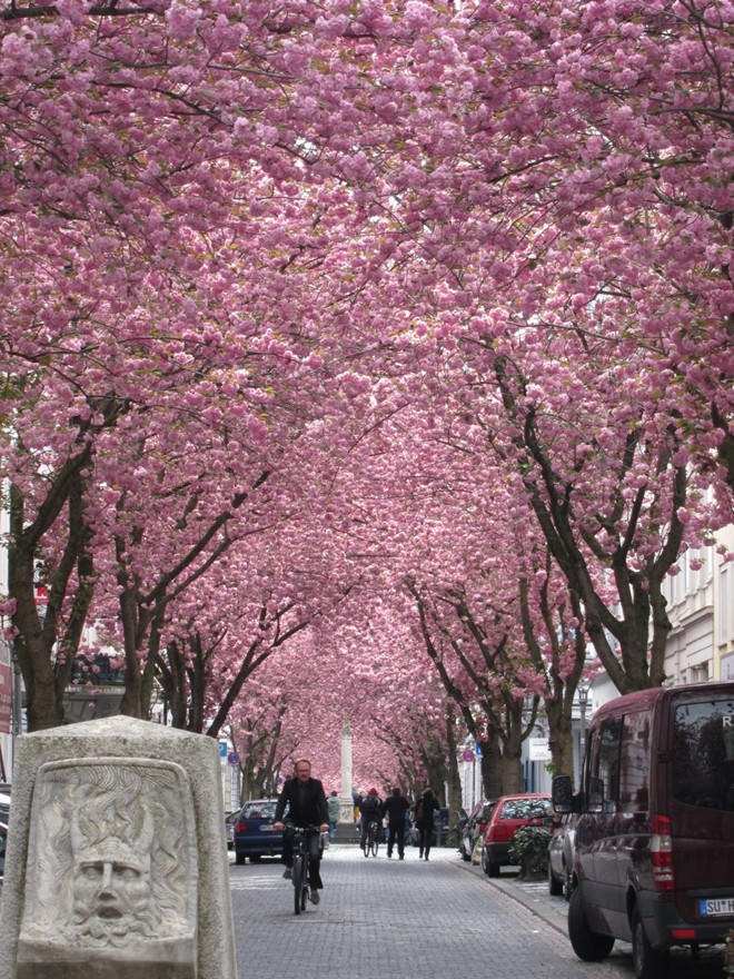 Đức: Đường hoa anh đào Heerstrasse ở thành phố Bonn, bên hông Đại học Nordtadt, cách tư dinh của nhà soạn nhạc nổi tiếng Bethoven 5 phút đi bộ trở thành bức tranh tuyệt đẹp vào mùa xuân. Giống hoa anh đào ở đây được mang sang từ Nhật Bản trong những năm 1980. Giờ đây, đường hoa anh đào trở thành một trong những điểm đến không thể bỏ qua mỗi khi du khách ghé thăm thành phố. Tháng 4 hàng năm, hai hàng cây trên nhiều đường phố của Bonn tạo thành những "đường hầm màu hồng" khiến du khách ngây ngất.