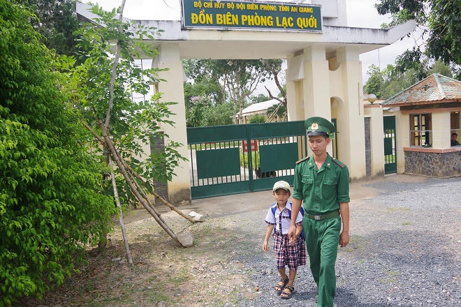 (PLVN) - “Hôm nay đi học phải chú ý nghe giảng, ghi chép cẩn thận, nhớ phải mang sổ liên lạc về nhà nghe con!”, Đại úy Nguyễn Hữu Hàn, Chính trị viên, Phó Đồn Biên phòng Cửa khẩu Long Bình (An Giang) vừa dặn dò, vừa cẩn thận chỉnh sửa lại khăn quàng, quần áo cho đứa “con nuôi” của đơn vị trước khi đến trường. Anh tận tình, ân cần như một người cha.