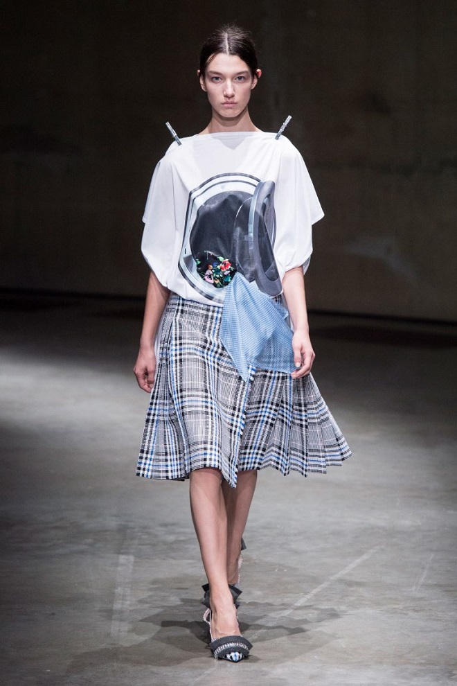 Không đơn giản in hình chiếc máy giặt, một thiết bị quá đỗi quen thuộc trong gia đình lên áo phông, Christopher Kane còn tạo hiệu ứng 3D bằng việc đính kết những miếng vải, kẹp quần áo hay túi lưới lên trang phục.