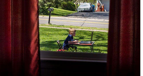 Cậu bé ngay lập tức bê bàn ghế và laptop ra ngoài vườn khi mẹ nói: "Con hãy ra ngoài chơi". |