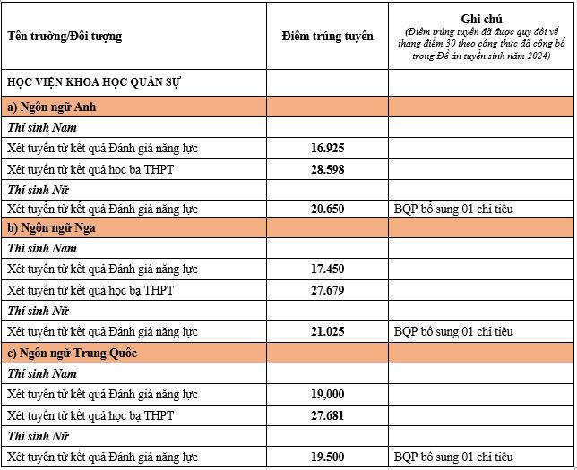Học viện Khoa học quân sự vừa công bố kết quả tuyển sinh đại học theo các phương thức xét tuyển sớm. Điểm chuẩn đối với nam dao động từ 17,45 đến 28,6 điểm. Đối với nữ, điểm chuẩn dao động từ 19,5 đến 23,8 ở cả 2 phương thức xét học bạ và xét điểm thi đánh giá năng lực.