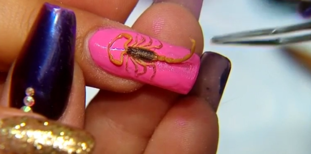Xu hướng làm đẹp không kém phần kinh dị khác là đắp bọ cạp chết lên móng tay, để tạo “ấn tượng khó quên” trong mắt người đối diện. Điều may mắn là trào lưu này không được quá nhiều người ủng hộ.