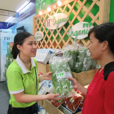 Giữa bộn bề gian hàng rau quả đầy màu sắc của Công ty CP Sản xuất và Cung ứng Rau quả sạch Quốc tế (FVF) thuộc tập đoàn TH, thứ trưởng Vũ Văn Tám vui vẻ hòa đồng cùng khách hàng ăn thử sản phẩm dưa chuột khi nhìn thấy bao bì sản phẩm được sản xuất theo tiêu chuẩn Vietgap và Global Gap.