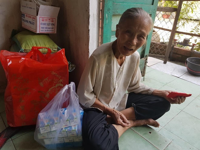Bà Đi rưng rưng nước mắt: “Tôi cảm ơn mọi người nhiều lắm. Có đoàn từ thiện hứa phụ cấp cho tôi hàng tháng tới lúc chết, tôi đã bớt phần nào nỗi lo”.