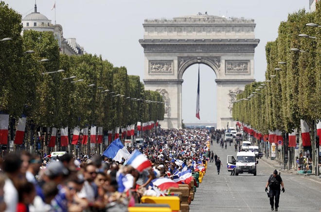 Khi đội tuyển Pháp từ Matxcơva trở về thủ đô Paris, 23 tuyển thủ và huấn luyện viên Didier Deschamps đã được chào đón như những vị anh hùng. Thảm đỏ ở phi trường, thảm đỏ tại phủ tổng thống chờ đón. Một biển người tràn ngập con lộ đẹp bậc nhất thế giới, Champs Elysées, đợi chiếc xe mui trần của đội bóng Pháp đi qua. Một tờ báo nước ngoài mô tả không khí lễ hội tại đây: