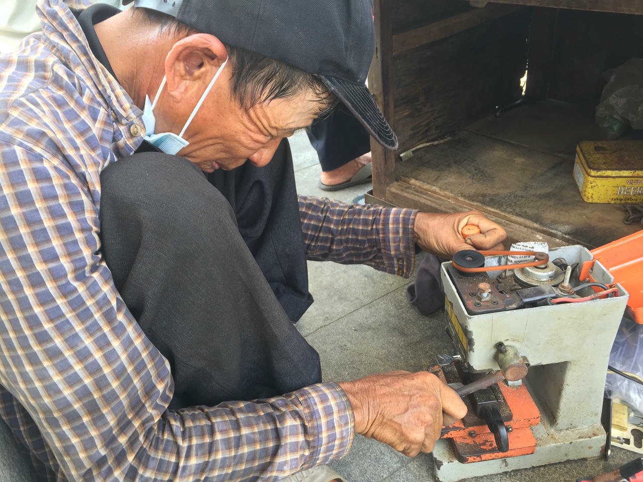 Người đi qua cầu Tràng Tiền, rẽ phải vào đường Trần Hưng Đạo (TP Huế, Thừa Thiên – Huế), ngày ngày nhìn thấy ngay chiếc tủ nho nhỏ đặt ở góc vỉa hè có đề mấy chữ “làm chìa khóa”. Mưa nắng như hằn vết thời gian trên chiếc tủ cũ nhòe màu sơn. Dòng chữ viết màu trắng đã ố màu càng trở nên xộc xệch vì bong tróc nhiều chỗ, khiến “tiệm” sửa chìa khóa toát lên vẻ già nua như chính dáng hình người đàn ông ngồi phía sau “tiệm”.