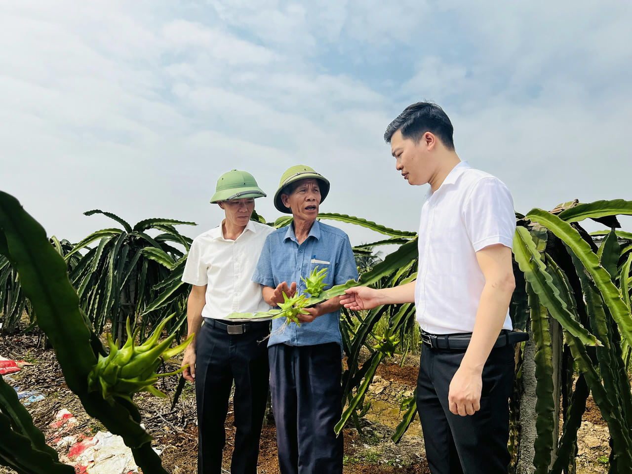 Lãnh đạo xã và Phòng Nông nghiệp và Phát triển nông thôn huyện An Lão tham quan cánh đồng thanh long hữu cơ. |
