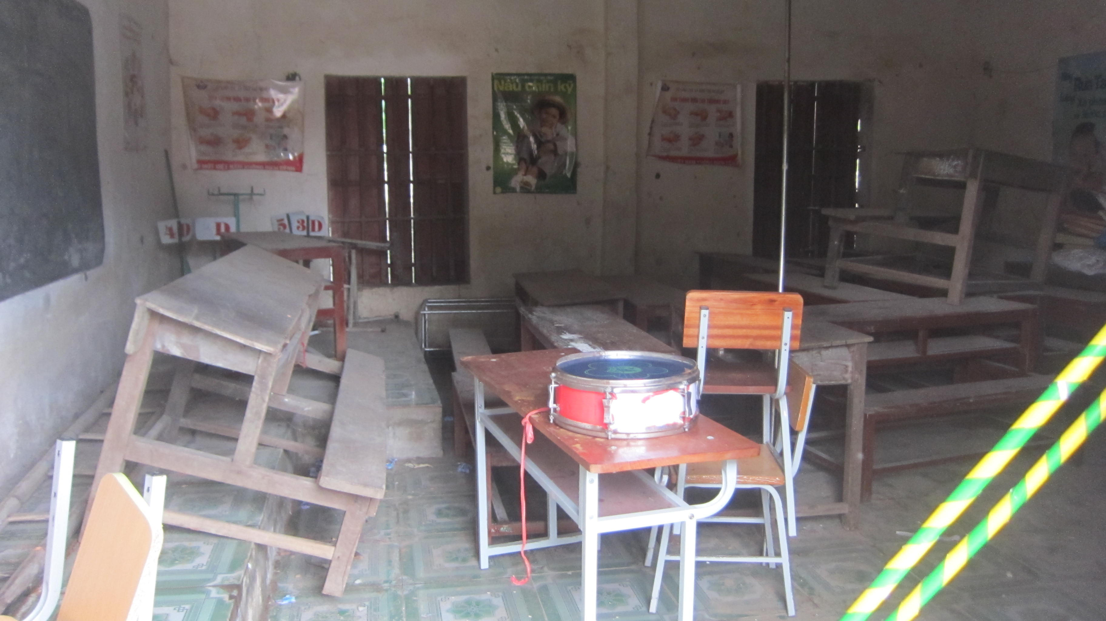 Dẫn chúng tôi xuống dãy nhà này, cô Chu Thị Hòa, Tổng phụ trách Đội cho biết, dãy nhà này có 2 phòng có mùi thuốc trừ sâu nặng nhất là phòng Truyền thống và phòng Mỹ thuật. Chỉ cần vào ngồi một lúc thì mùi xộc lên mũi, rất khó chịu. Nhưng vì trường đang thiếu phòng nên đành chấp nhận để các đồ dùng như trống, cờ trong các phòng này. “Cứ đầu tuần lại phải nín thở đến lấy đồ để phục vụ cho các hoạt động của nhà trường”, cô Hòa nói.