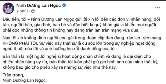 15h cùng ngày, nữ diễn viên đã chính thức lên tiếng trên Facebook cá nhân. Đầu tiên, cô gửi lời xin lỗi đến nhãn hàng, người thân, bạn bè và khán giả. Đồng thời, cô khẳng định: "Người con gái trong đoạn clip đen đang tràn lan trên mạng KHÔNG PHẢI TÔI. Sự việc này thật sự là cú sốc lớn trong sự nghiệp hoạt động của tôi và ảnh hưởng lớn dến danh tiếng của tôi".