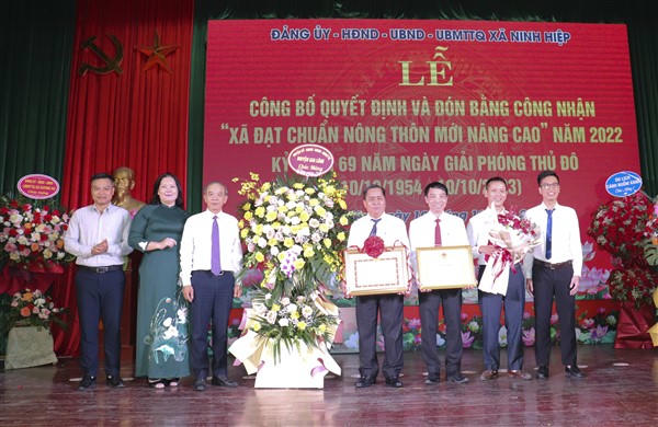 (PLVN) - Chiều 10/10/2023, Đảng bộ, chính quyền và nhân dân xã Ninh Hiệp, huyện Gia Lâm, Hà Nội, long trọng tổ chức Lễ công bố và đón nhận danh hiệu Xã đạt chuẩn nông thôn mới nâng cao.