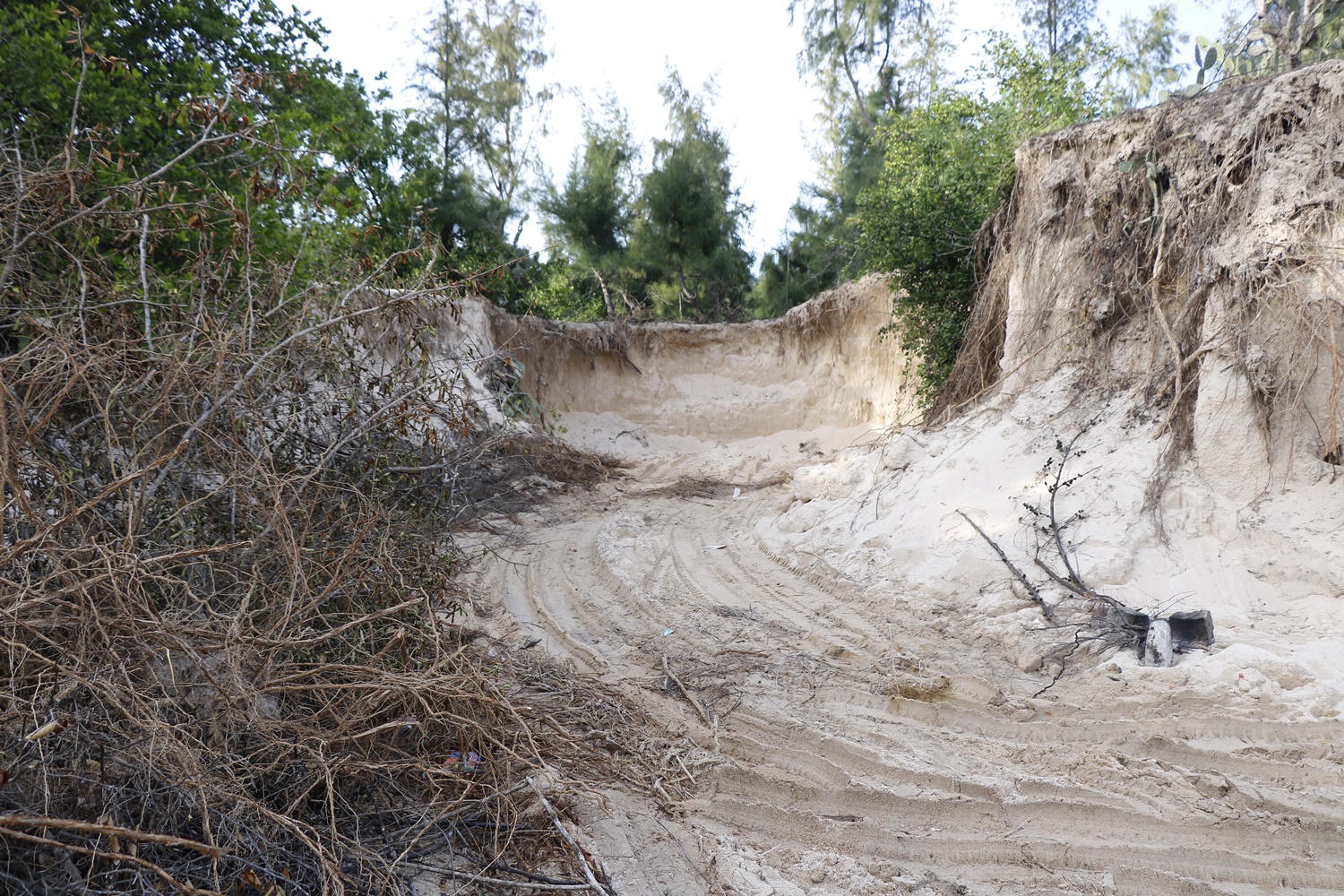 Nhìn rộng ra khu vực xung quanh, trên diện tích khoảng 1ha, các đối tượng đã đào bới khai thác hàng nghìn khối cát, biến mặt rừng dương thành hố sâu từ 3 - 5m kéo dài như một thung lũng. Hàng trăm cây dương bị bật gốc, đốn hạ, một số cây khác đã chết khô từ lâu. Ngoài ra, còn có hàng trăm cây bụi lớn nhỏ bị đào trốc gốc nằm ngỗn ngang trong lòng “thung lũng” cát.