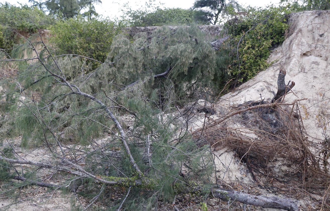 Tiếp cận hiện trường các đối tượng vừa khai thác, chúng tôi ghi nhận những hố cát vừa bị đào thành hàm ếch ăn sâu vào các gốc dương. Một số cây dương vừa ngã đổ do bị đào trốc gốc, một số cây khác bị đốn ngang gốc để giải phóng đường đi cho xe chở cát, nhiều cây bị khoét trơ rễ có khả năng ngã đổ bất cứ lúc nào.