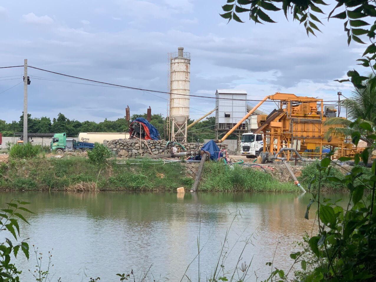 Xe chở đất đưa về đổ xuống sông Dinh sàng rửa để lấy cát, sỏi. |