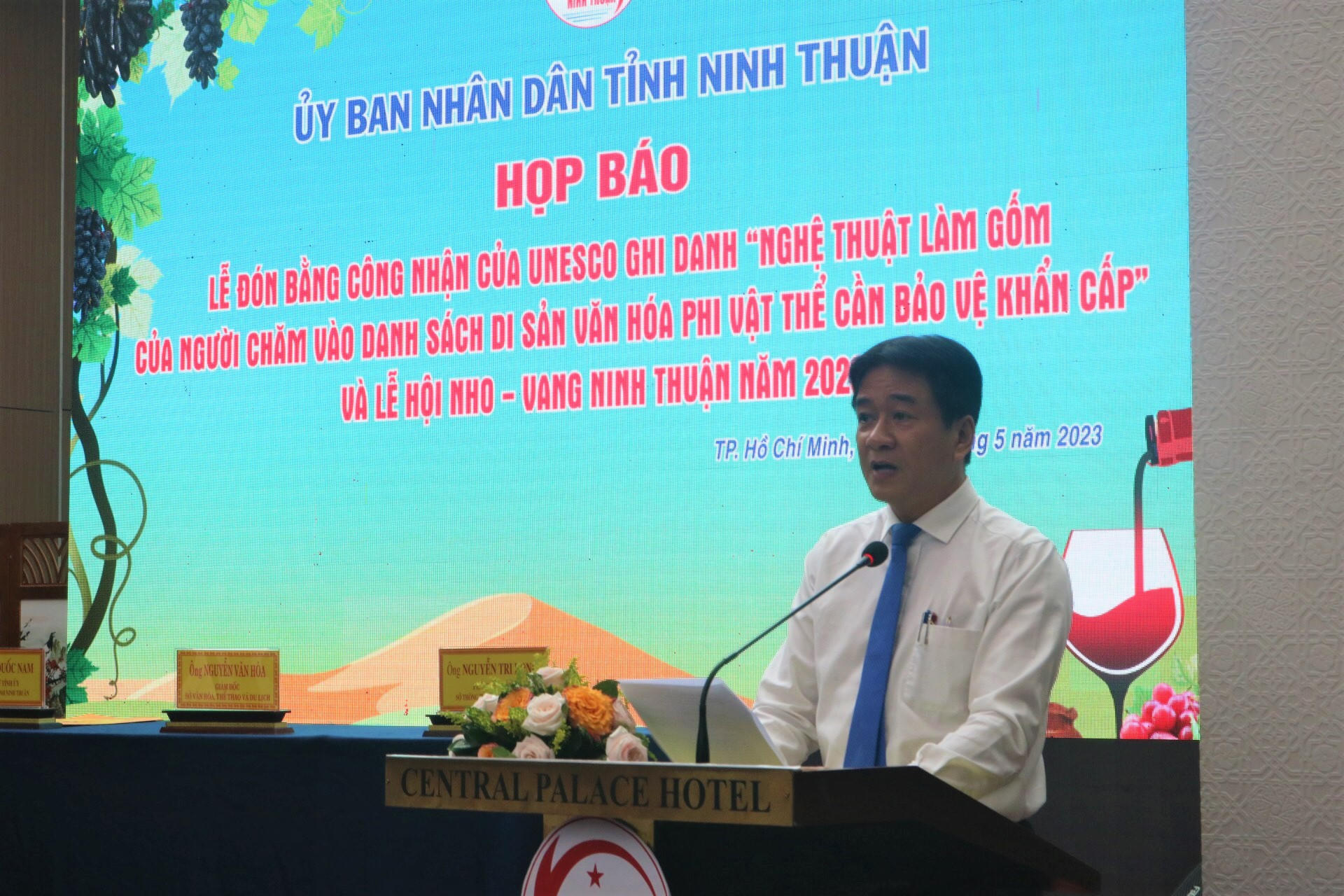 Theo thông tin tại buổi họp báo, Lễ đón Bằng công nhận của UNESCO ghi danh Nghệ thuật làm gốm của người Chăm vào Danh sách di sản văn hóa phi vật thể cần bảo vệ khẩn cấp và Lễ hội Nho -Vang Ninh Thuận năm 2023 sẽ được diễn ra từ ngày 13/6/2023 đến ngày 18/6/2023.