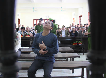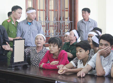 Từ rất sớm, căn phòng xét xử của TAND tỉnh Nghệ An chật kín người, bên trái là những người chít khăn tang và tấm di ảnh của người phụ nữ xấu số Trần Thị Dụ, bên phải căn phòng là người thân của bị cáo. Cách đây hơn nửa năm, những người này vẫn còn là thông gia thân thiết, hôm nay họ trở thành hai đại diện cho bị cáo và người bị hại, họ lặng lẽ ngồi nhìn nhau không ai hỏi ai câu nào.