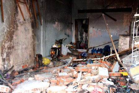 Tại hiện trường, toàn bộ căn nhà ba tầng cháy đen. Nhiều tài sản, vật dụng sinh hoạt bên trong hư hại nghiêm trọng. Hai chiếc xe máy cháy rụi. Hàng trăm bình gas được đưa ra ngoài.