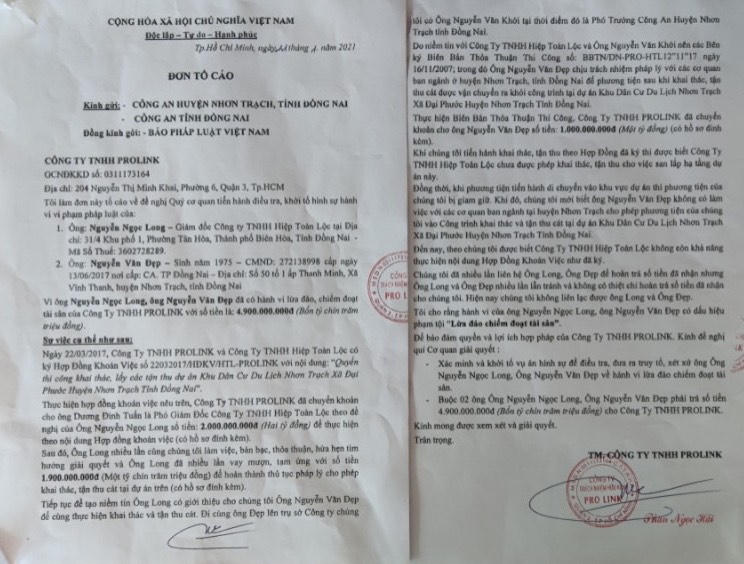 Theo nội dung đơn tố cáo của Công ty TNHH PROLINK, ngày 22/3/2017, sau khi ký hợp đồng khoán việc như đã nói ở trên, Long đề nghị Công ty PROLINK chuyển cho Long số tiền 2 tỷ đồng. Sau khi nhận tiền một thời gian ngắn, ông Long lại tiếp tục yêu cầu Công ty này chuyển thêm số tiền 1,9 tỷ với lý do hoàn thành những thủ tục pháp lí, để được phép khai thác, tận thu cát tại dự án.