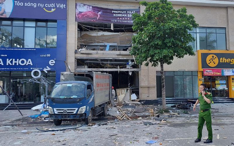 Nhà hàng xảy ra sự cố có kết cấu 2 tầng, nằm dưới sảnh tòa nhà The City Light (phường Khai Quang, TP Vĩnh Yên). Áp lực vụ nổ khiến toàn bộ kính chịu lực của nhà hàng 2 tầng vỡ vụn văng xa hàng chục mét.