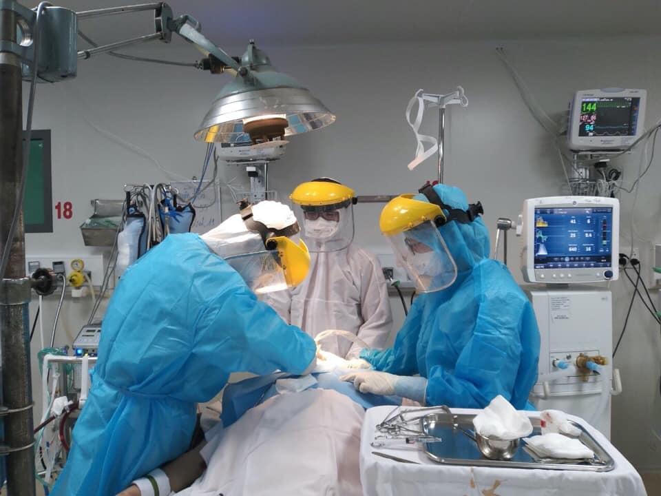 Một bệnh nhân COVID-19 nguy kịch đang được đội ngũ điều trịthăm khám và chăm sóc. Ảnh: BVCC |