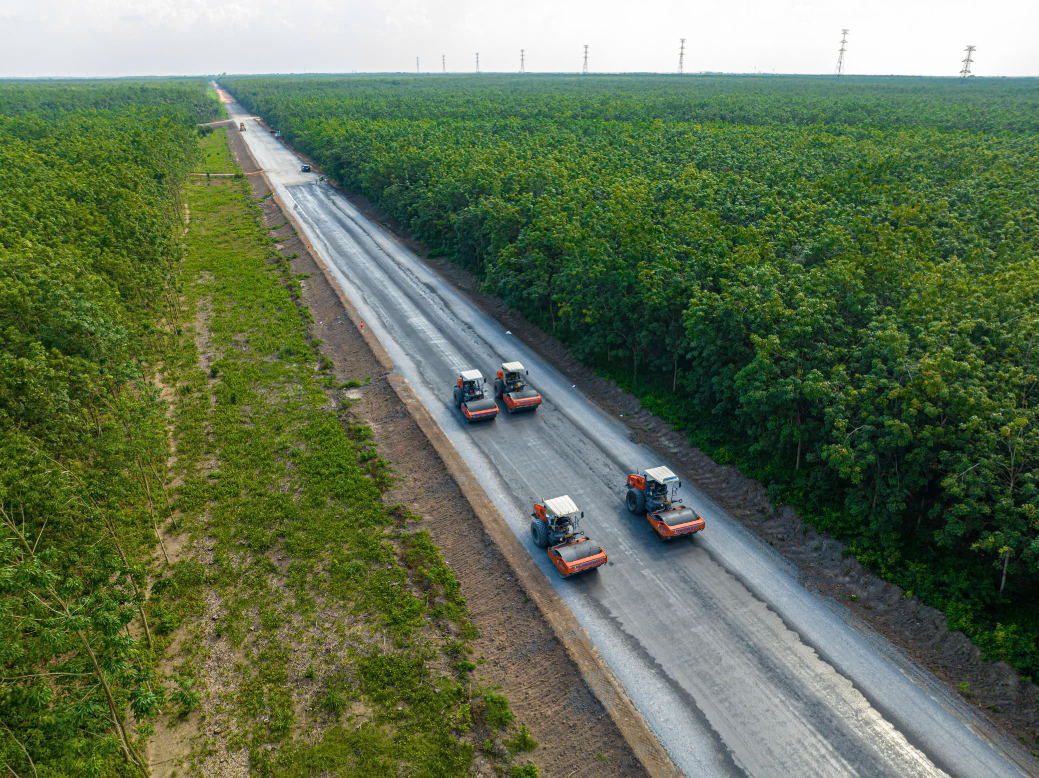 Dự án đầu tư xây dựng đường Hồ Chí Minh đoạn Chơn Thành - Đức Hòa đi qua tỉnh Bình Dương với tổng chiều dài 30,85km, quy mô đường cao tốc 6 làn xe, vận tốc thiết kế 100 km/h. Trong ảnh: Thi công lu lèn cấp phối đá dăm đoạn Km19+950 - Km40+900 thuộc địa phận huyện Dầu Tiếng.