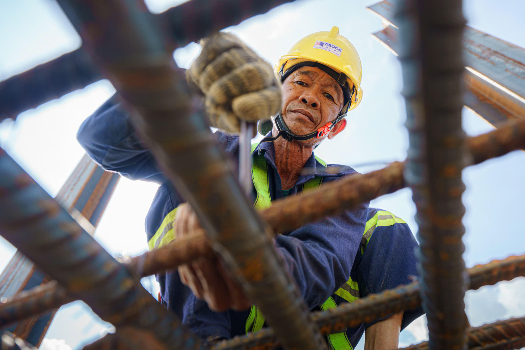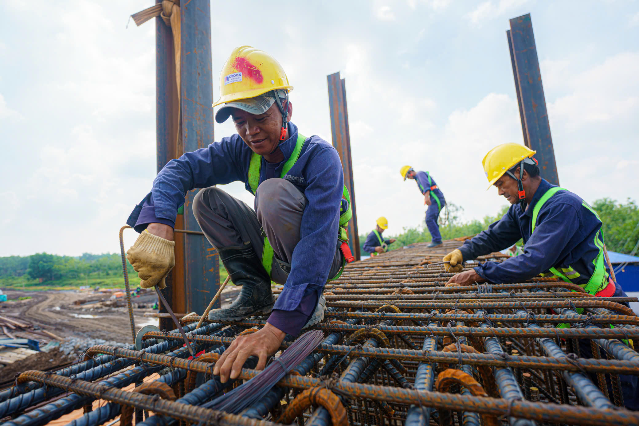 Sản lượng thực hiện xây lắp của toàn dự án đến nay đạt 423/1.665 tỷ đồng (đạt 25,5% giá trị hợp đồng), cơ bản đảm bảo tiến độ. Gói thầu XL01 sản lượng thực hiện là 151/615 tỷ đồng, đạt 25% giá trị hợp đồng. Trong ảnh: Công nhân đang thi công hạng mục cốt thép xã mũ, đảm bảo tiến độ đề ra.