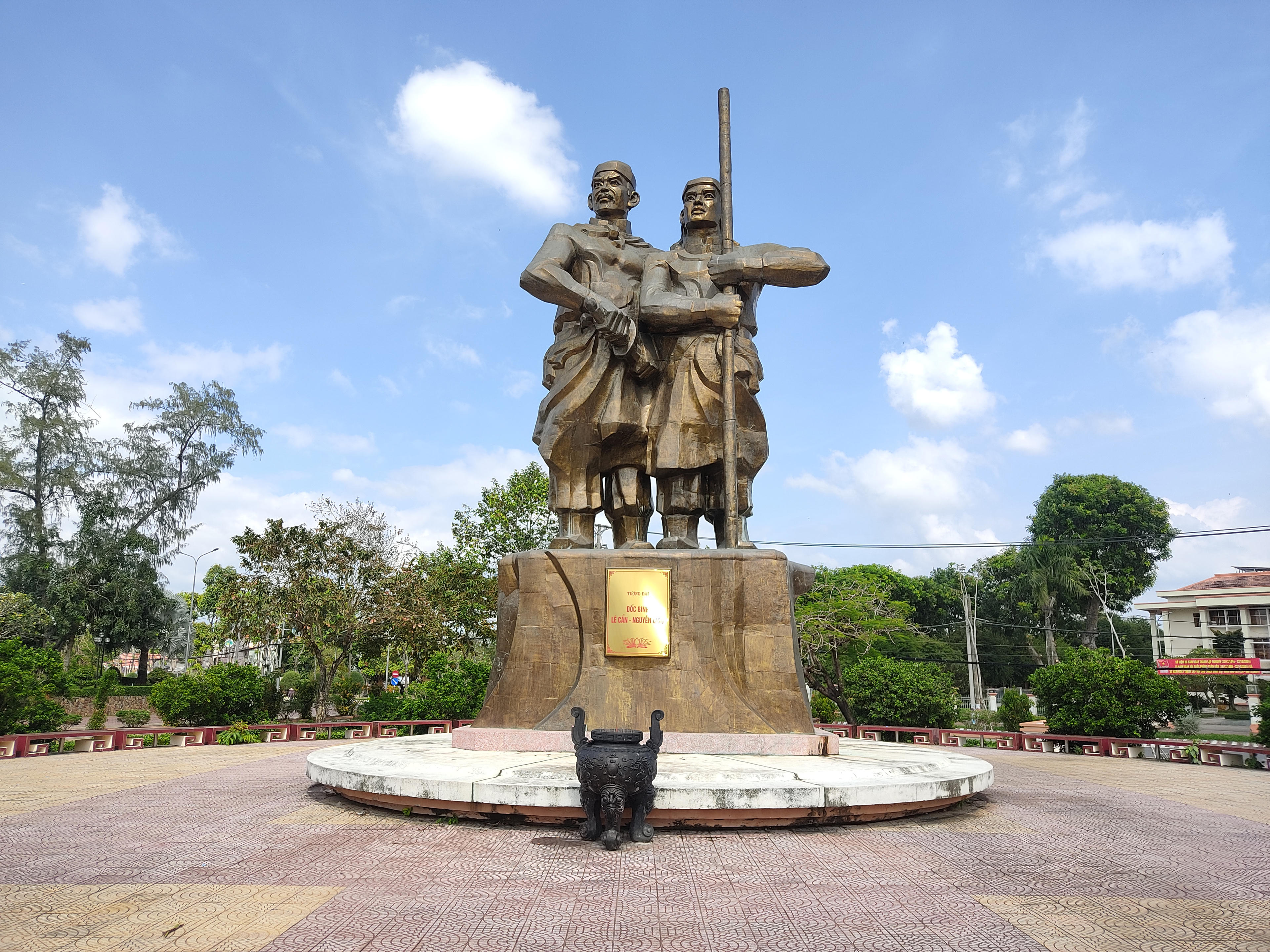Tượng đài Đốc binh Lê Cẩn cùng Phó tướng Nguyễn Giao đứng uy nghiêm với binh khí trong tay (đoạn ngã ba An Nhơn, TT Vũng Liêm) là một trong những địa chỉ đỏ cho thế hệ trẻ ngày nay. |