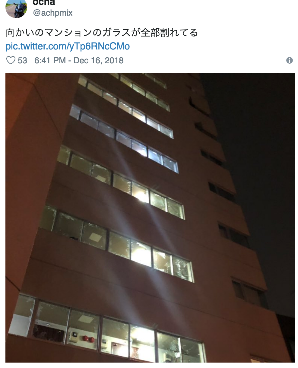 Một vụ hỏa hoạn đi kèm nổ bình ga đã đánh đổ nhiều toà nhà. Người dân báo cáo có mùi xăng sau vụ nổ và phát hiện ra cửa sổ bị vỡ trong khu vực (theo đài NHK). Vụ nổ, xảy ra vào khoảng 8:30 tối giờ địa phương.