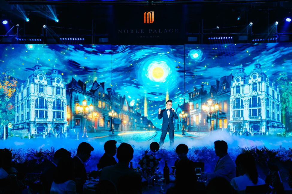 Tại sự kiện tối 4/8, kiến trúc tinh tế của Noble Palace Long Bien được phô diễn hoàn hảo trong màn trình diễn của ca sĩ Bằng Kiều, lấy cảm hứng từ kiệt tác "Đêm đầy sao" của danh hoạ Van Gogh