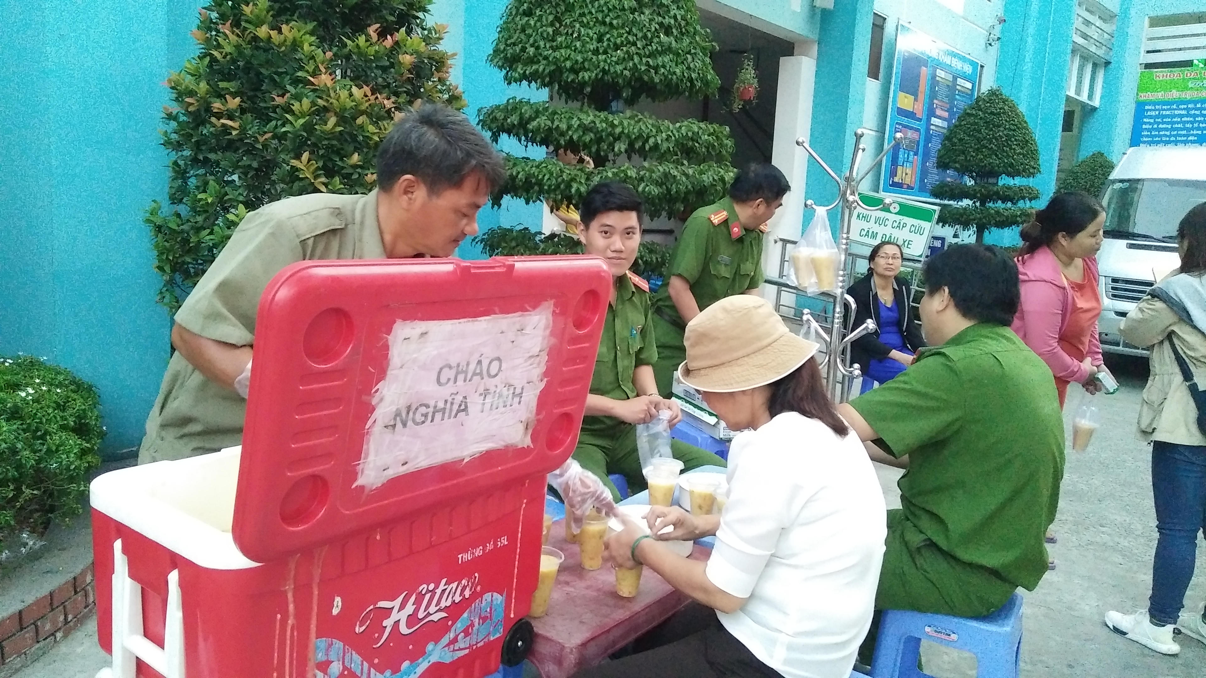 Nồi cháo nghĩa tình của Trung tá Tài và cán bộ chiến sĩ công an phường Tam Phú nhận được sự ủng hộ nhiệt tình từ người dân. Một số người tự nguyện dậy sớm đến bệnh viện cùng phụ công việc phát cháo.