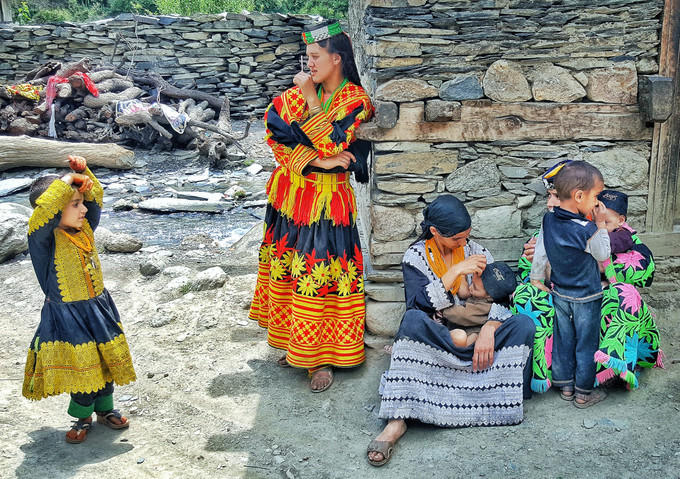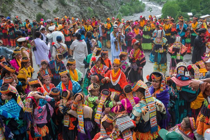 Trang phục truyền thống của người Kalash rất sặc sỡ với sợi dệt cầu vồng, mũ đính cườm và lông vũ. Bộ tộc này có niềm tin tôn giáo và ngôn ngữ riêng. Họ tôn vinh các vị thần thông qua âm nhạc, khiêu vũ và rượu. Họ tin rằng thần linh có những linh hồn và sứ giả truyền tin qua thế giới tự nhiên. Để thỉnh cầu thần linh, người Kalash dựng bàn thờ và cúng tế dê. Ảnh: UmairAshfaq/Shutterstock.