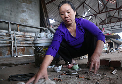 Đến giờ nấu cơm tối song năm mẹ con bà Nghiêm Thị Gái (58 tuổi) vẫn ngồi thẫn thờ trước hiên nhà. Dọn dẹp cả ngày vẫn chưa hết đầu đạn nên bà chẳng yên tâm. Hai đêm trước khi phát nổ, bà nghe thấy tiếng tí tách quanh nhà nên đến giờ vẫn ám ảnh. "Nghe tiếng rán cá nhà hàng xóm tôi cũng lẩy bẩy", bà nói.