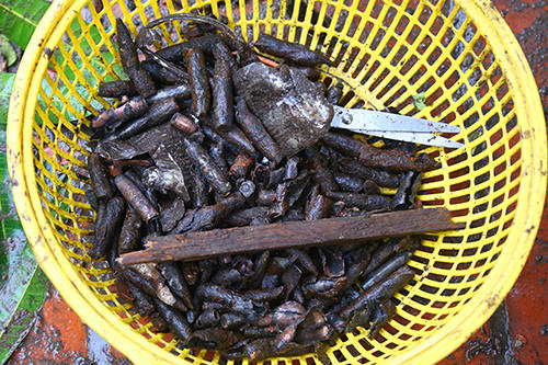 Bà Chín đội mưa cùng con cháu nhặt đạn. Ảnh:Phạm Dự. |