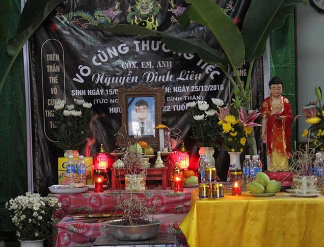 Ngày 29/12, 5 ngày sau cái chết của đứa con trai duy nhất tại Nhật Bản, căn nhà nhỏ ở khối 7, phường Nghi Thủy, thị xã Cửa Lò, tỉnh Nghệ An vẫn chìm trong không khí nặng nề. Người ra, người vào lặng lẽ. Thi thể nạn nhân Nguyễn Đình Liên (SN 1995) vẫn còn ở Nhật nên gia đình chưa phát tang, chỉ dựng tạm một bàn thờ khói nhang nghi ngút. Dù hàng xóm, bà con đến chia buồn, cha nạn nhân là ông Nguyễn Đình Văn (SN 1963) vẫn suy sụp trước sự ra đi quá bất ngờ của con trai.