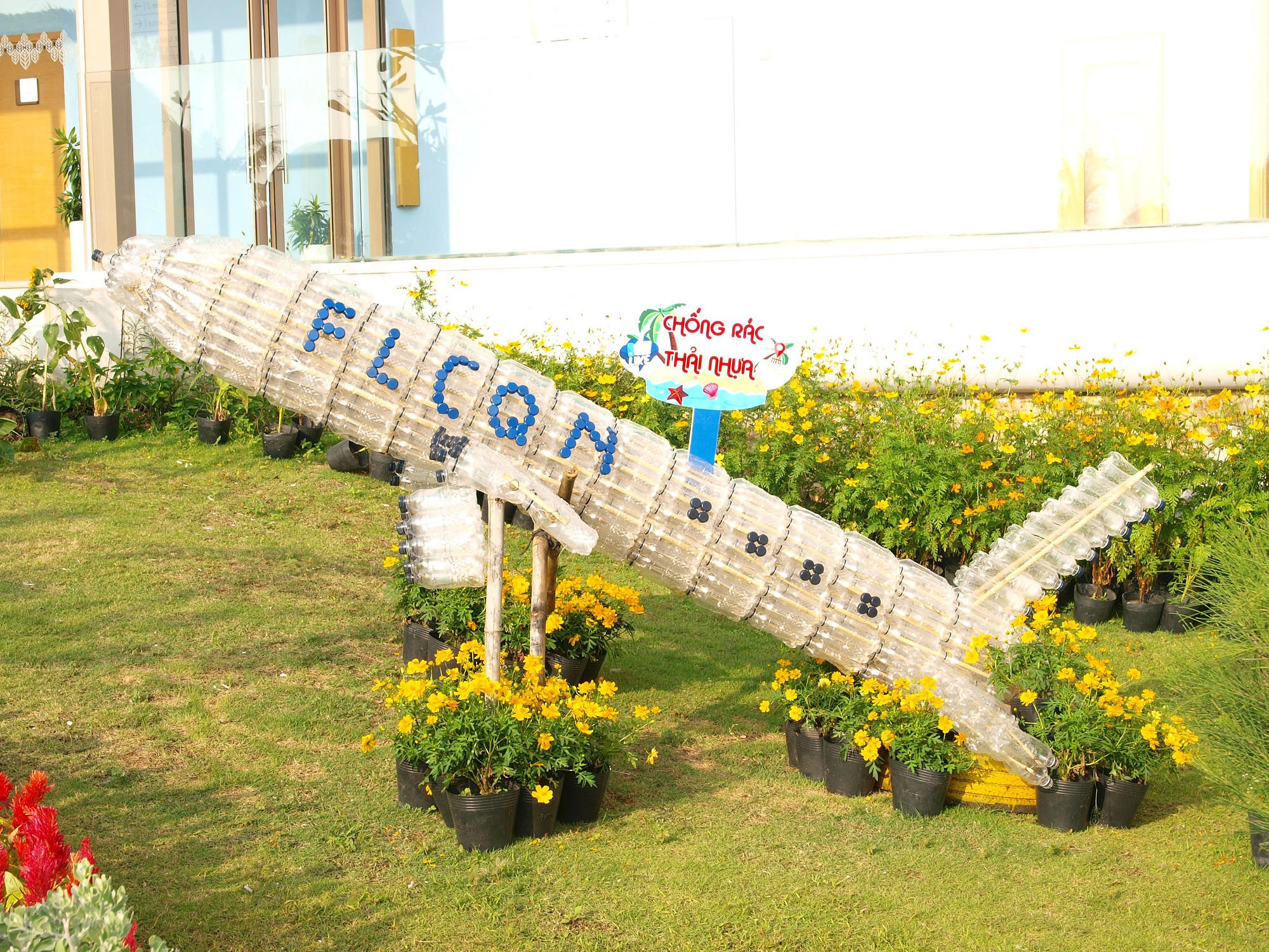 Không chỉ dọn dẹp rác định kỳ tại các bãi biển và Eo Gió, nhiều giải pháp đồng bộ khác cũng được quần thể triển khai như: thay thế toàn bộ chai lọ nhựa hóa mỹ phẩm bằng chai sứ, sử dụng các vòi nước cảm biến tự ngắt để tiết kiệm nước, tận dụng vỏ chai nước nhựa bỏ đi để chế tạo các mô hình máy bay trang trí trong khuôn viên…