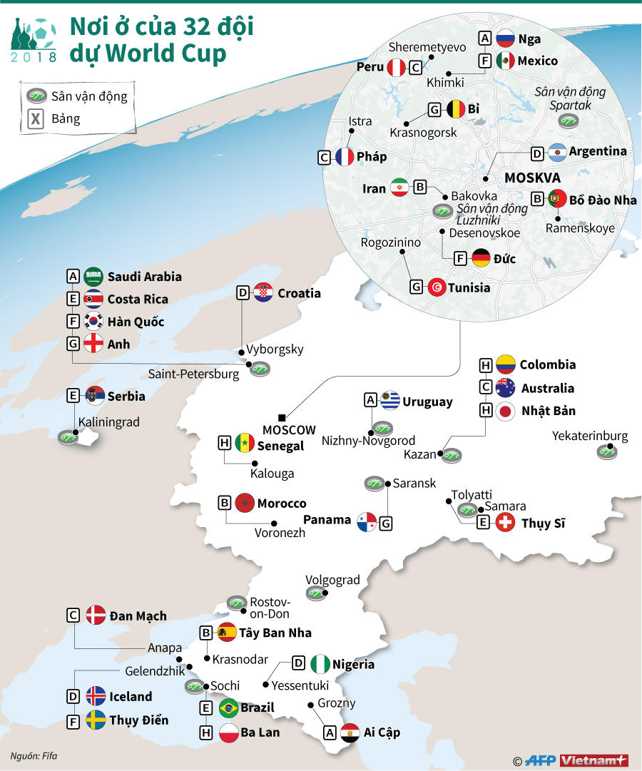 Nơi ở của 32 đội tuyển dự World Cup 2018