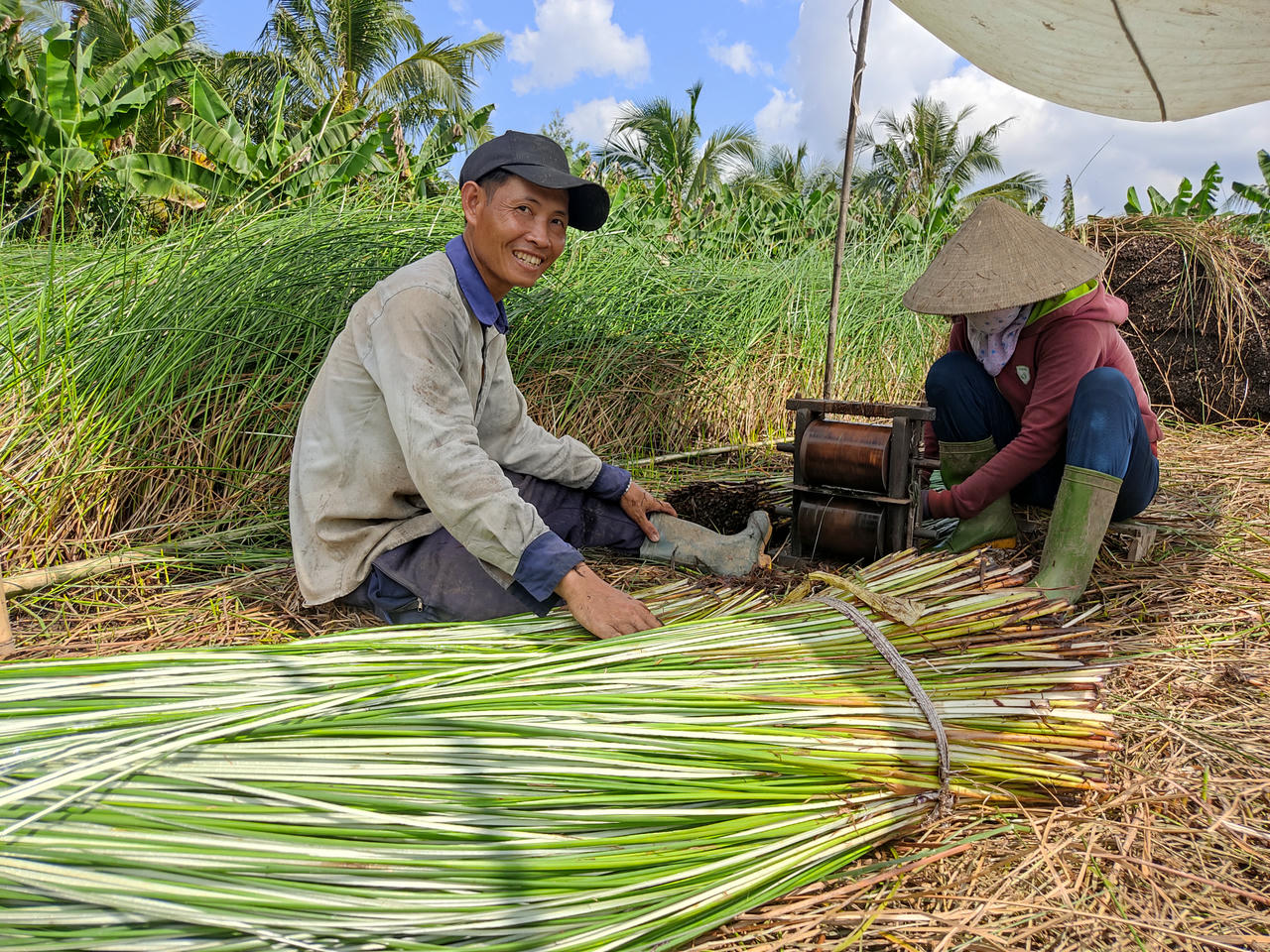 Dưới ánh nắng gay gắt cuối năm 2023, ông Lưu Văn Lập (SN 1972, ngụ xã Đức Mỹ, huyện Càng Long) đang gặt lác. Ông Lập phấn khởi cho biết, cận Tết Nguyên đán, cây lác rất được giá. Nhờ vậy, Tết năm nay gia đình ông sẽ có thêm khoản tiền để chi tiêu trong gia đình.