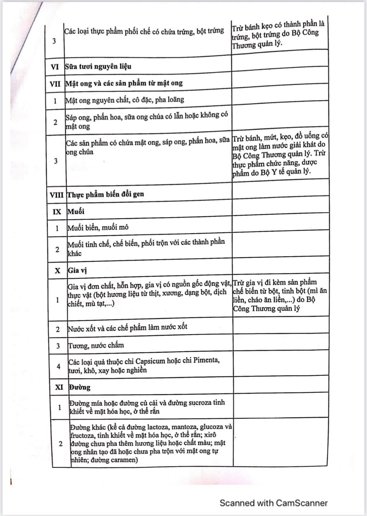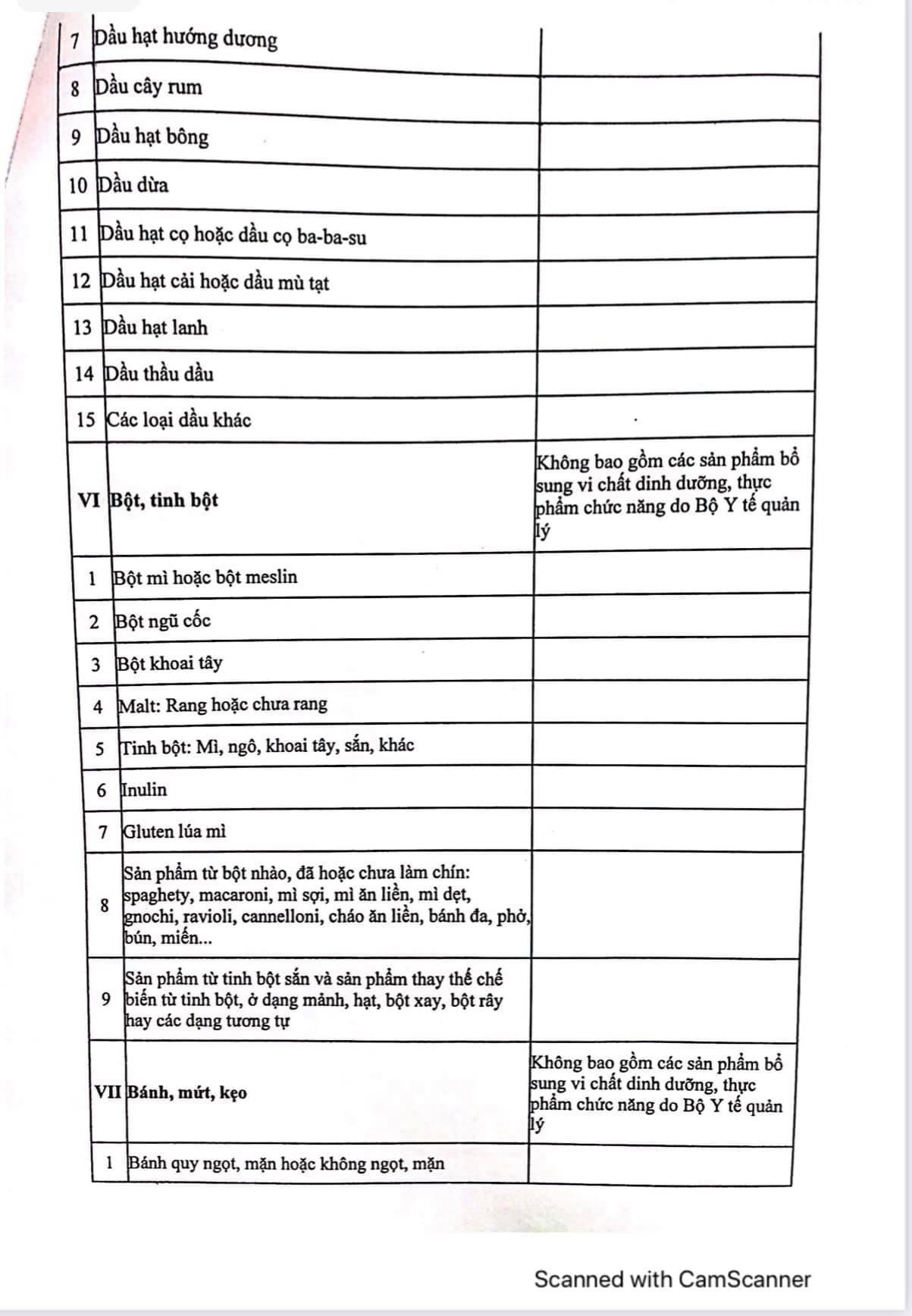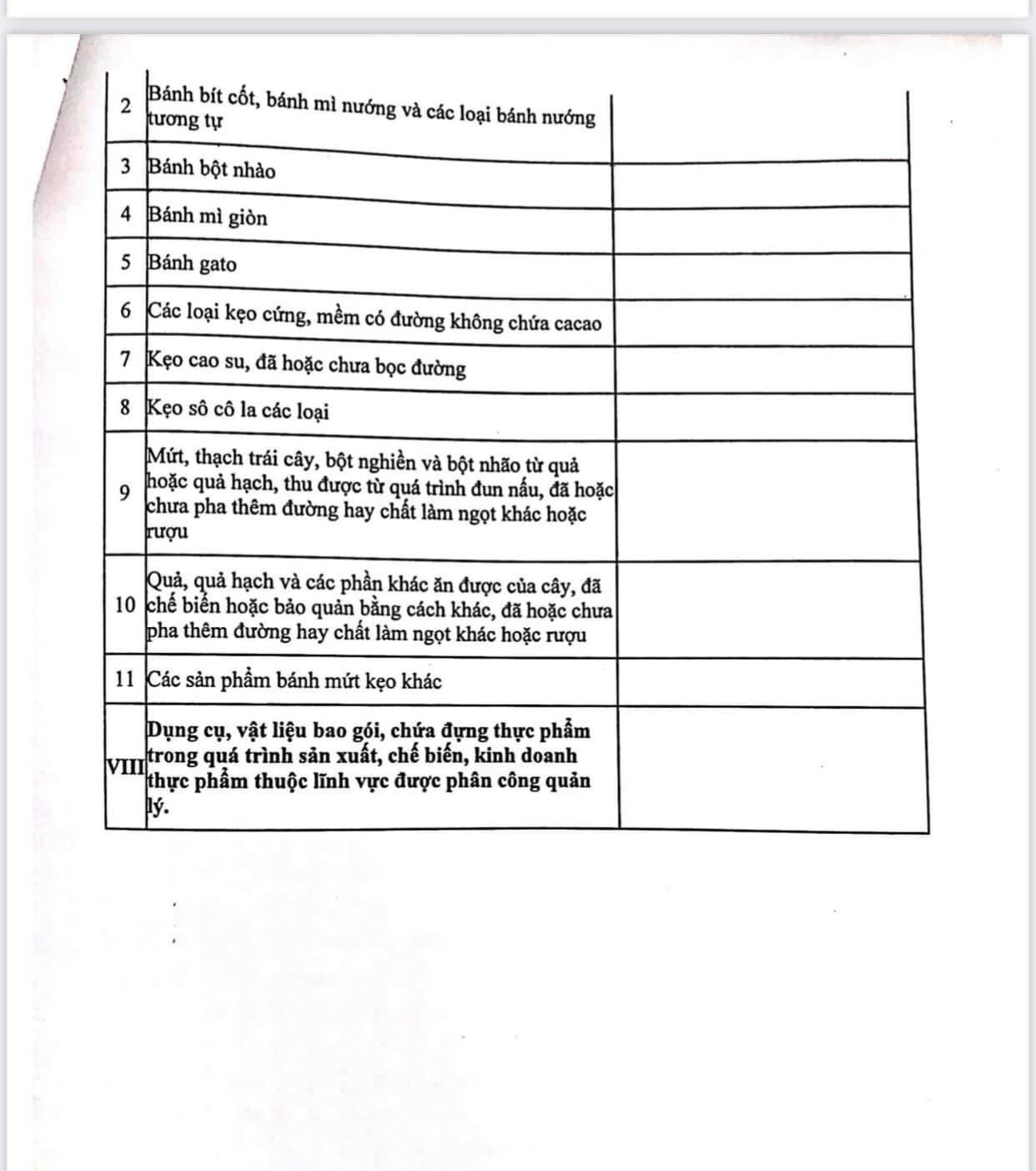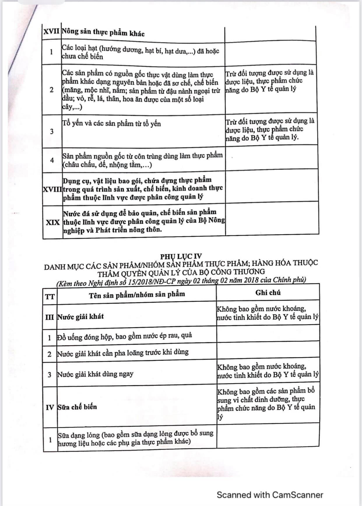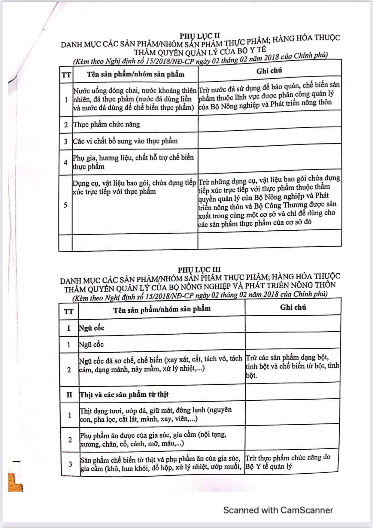 - Nhóm thực phẩm (bao gồm các mặt hàng theo danh mục phụ lục II, phục lục III và mục 3, 4, 5, 6, 7, 8 phụ lục IV ban hành kèm nghị định số 15/2018/NĐ-CP ngày 2-2-2018 của chính phủ hướng dẫn một số điều của Luật An toàn thực phẩm, cụ thể tại phụ lục đính kèm.