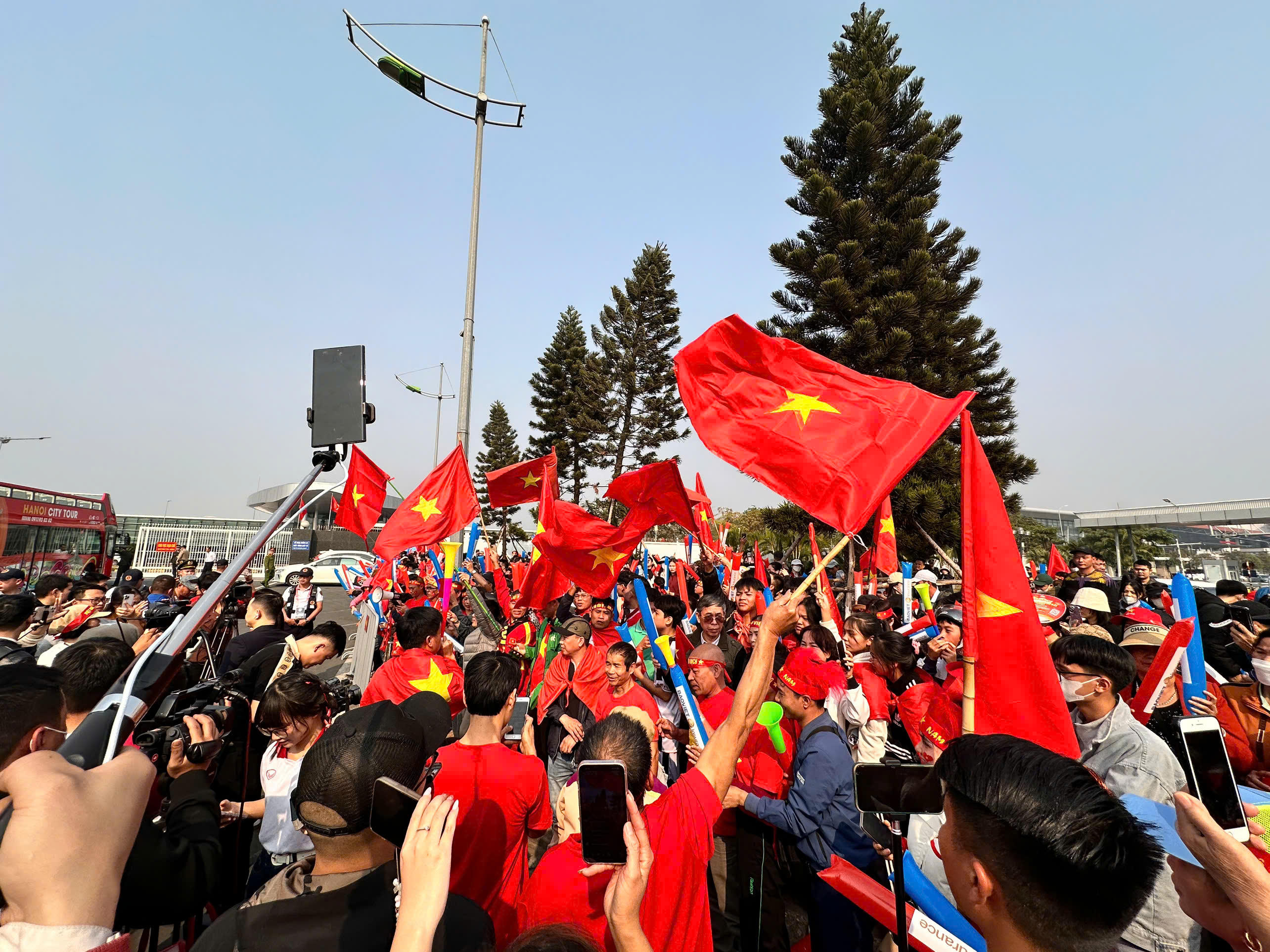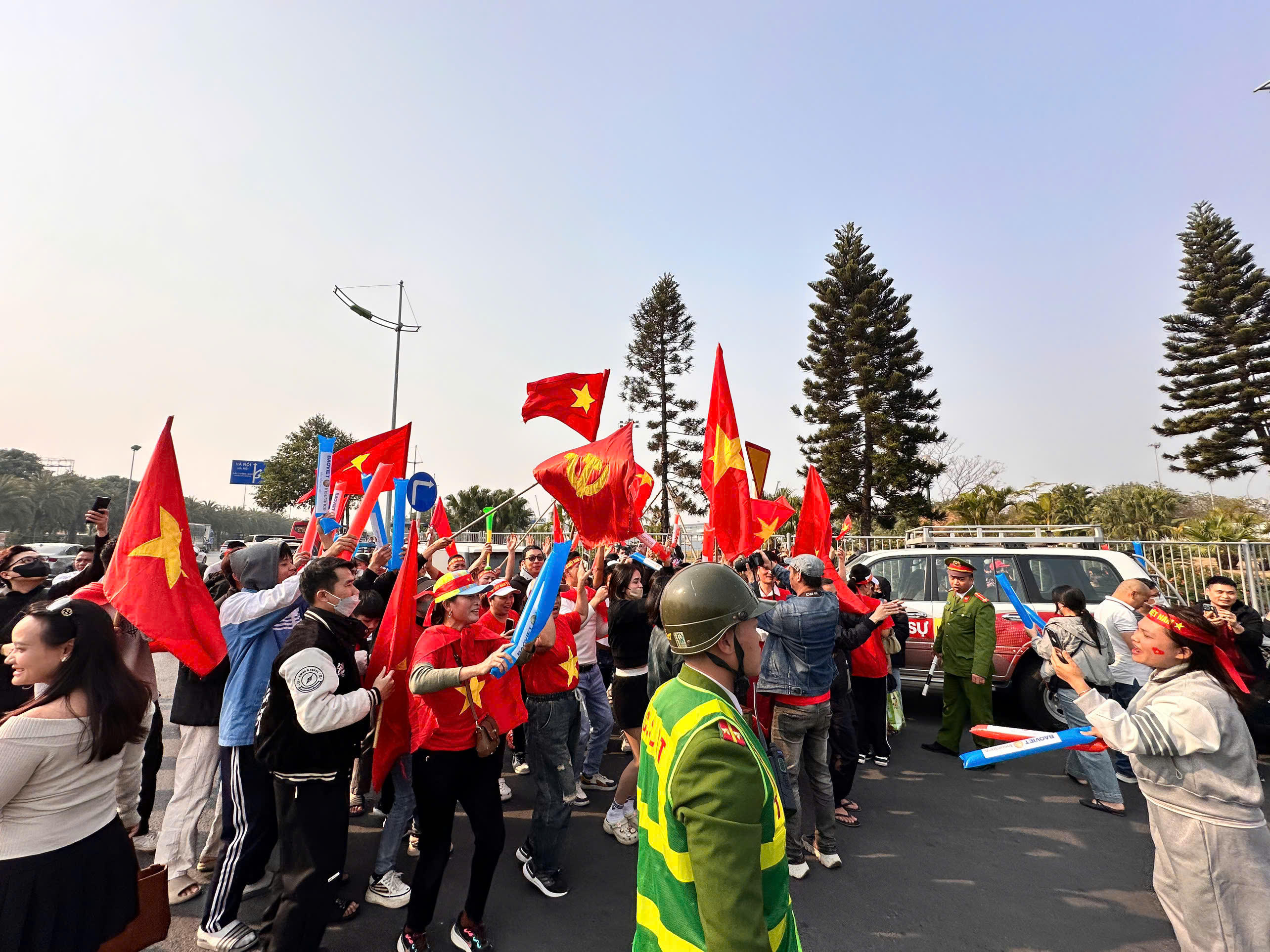 Càng gần đến giờ máy bay hạ cánh, dòng người hâm mộ đổ về càng đông. Họ đứng kín hai bên đường dẫn vào sân bay, mang theo trống, kèn và những băng rôn ghi dòng chữ cổ vũ, gọi tên các cầu thủ và HLV trưởng Kim Sang Sik.