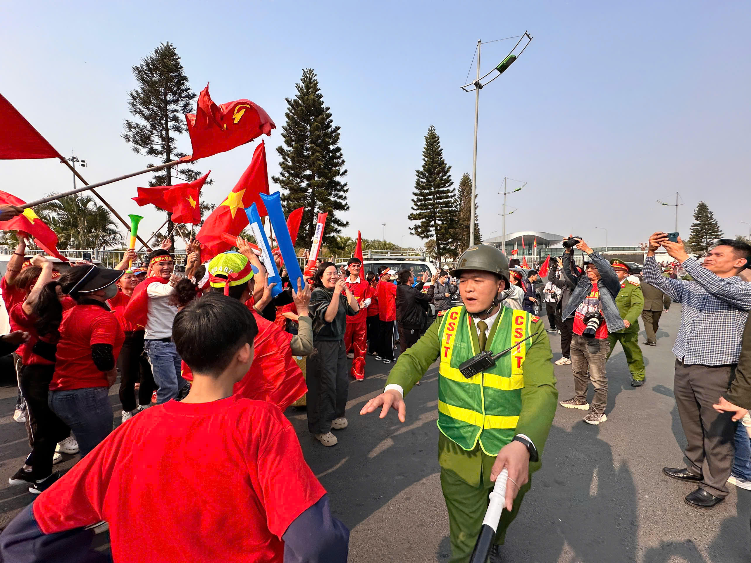 Lực lượng CSGT hướng dẫn người hâm mộ, đảm bảo an toàn an ninh tại sân bay. |