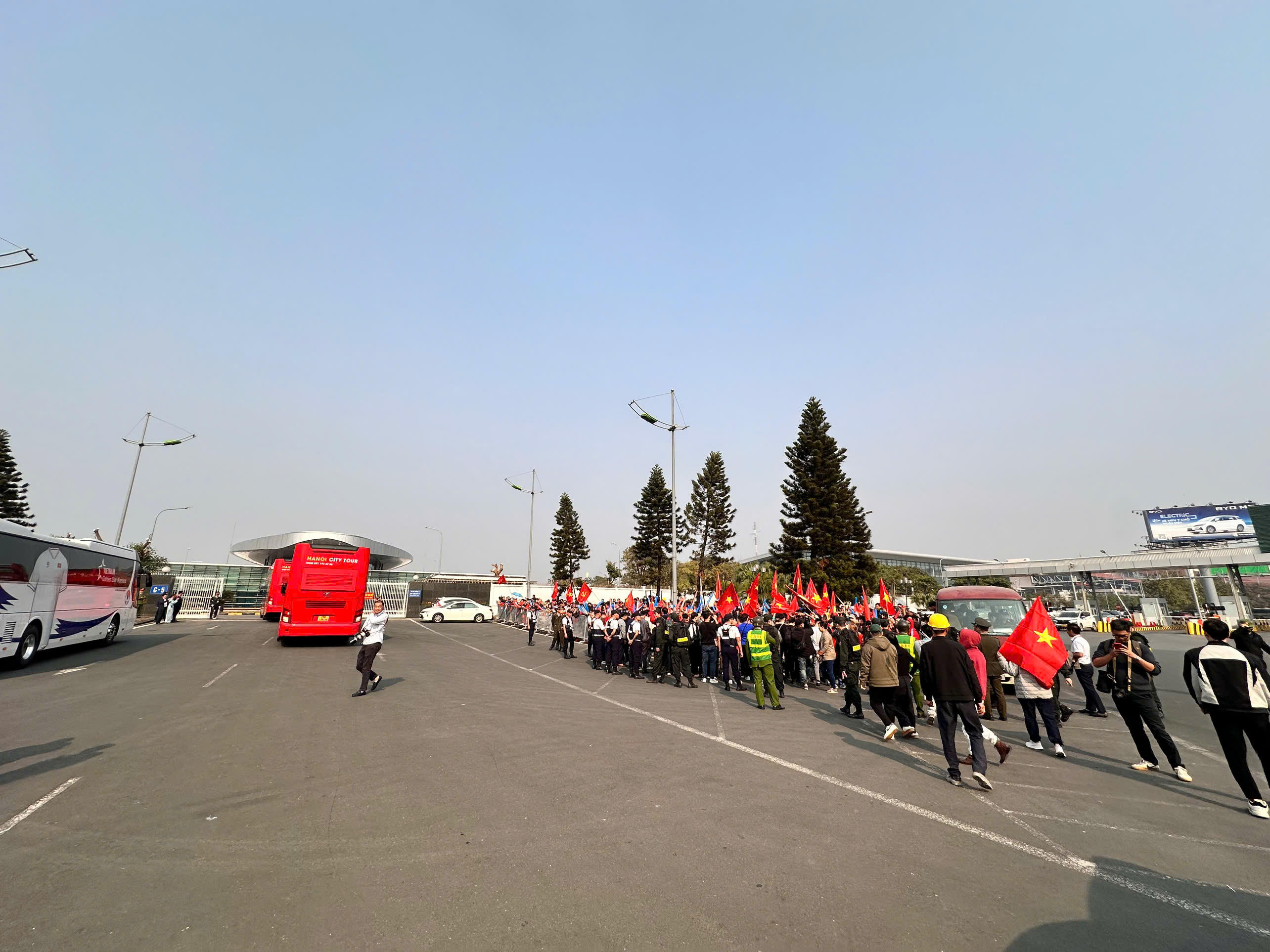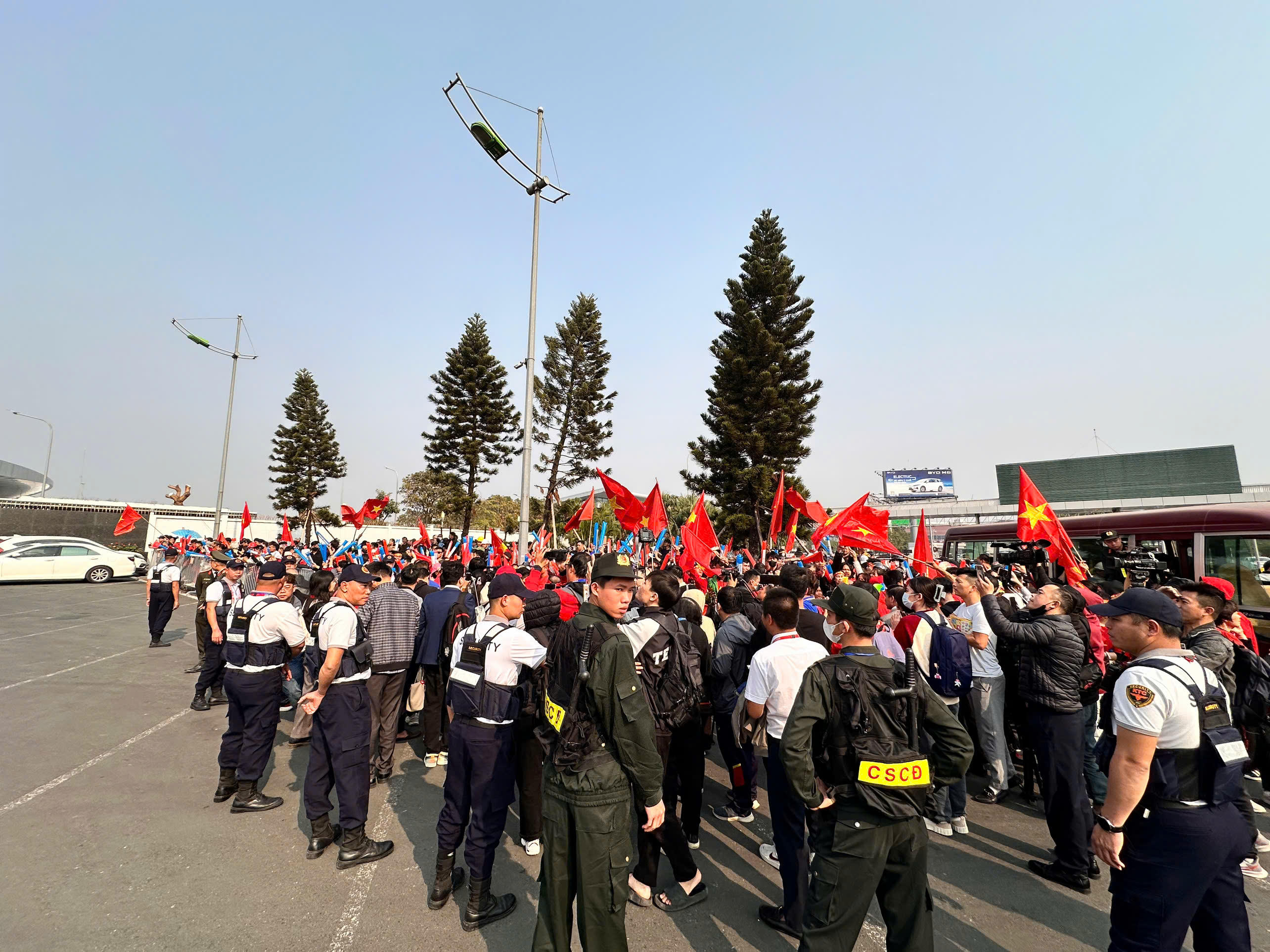 Lực lượng bảo vệ lập hàng rào, đảm bảo an ninh tại điểm đón các cầu thủ. |
