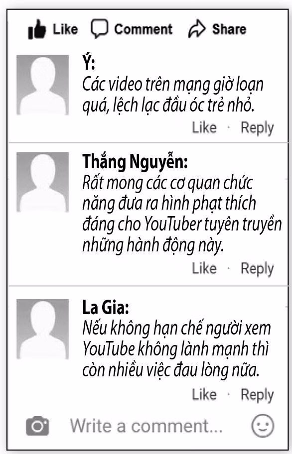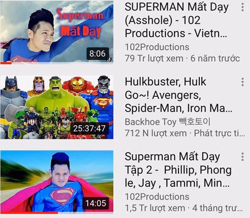 Tương tự, chị Nguyễn Thị Thúy Loan (26 tuổi, ngụ TP.HCM) cũng tá hỏa khi con trai xem một đoạn video có tựa đề “Superman mất dạy” với những câu chửi. Qua tìm hiểu, chị Loan biết những video này không có dán nhãn cấm trẻ em ở ngoài ảnh bìa. “Tôi phải vào tận phần giới thiệu của kênh thì mới có một dòng chữ kênh này chỉ dành cho người trên 18 tuổi. Trong khi những đứa trẻ chỉ cần thấy có siêu nhân là bấm vào coi, nhiều khi YouTube phát tự động nữa”, chị Loan bức xúc.