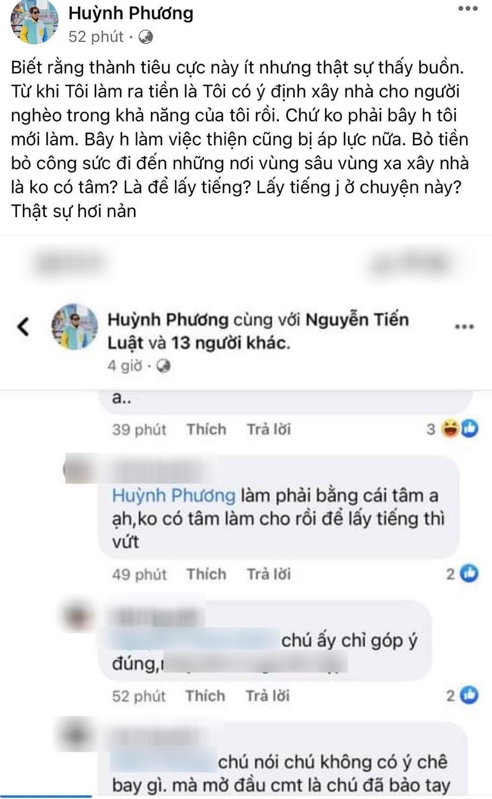 Huỳnh Phương bức xúc: "Bỏ tiền, bỏ công sức đi đến những nơi vùng sâu vùng xa xây nhà là không có tâm? Là để lấy tiếng? Lấy tiếng gì ở chuyện này? Thật sự hơi nản".