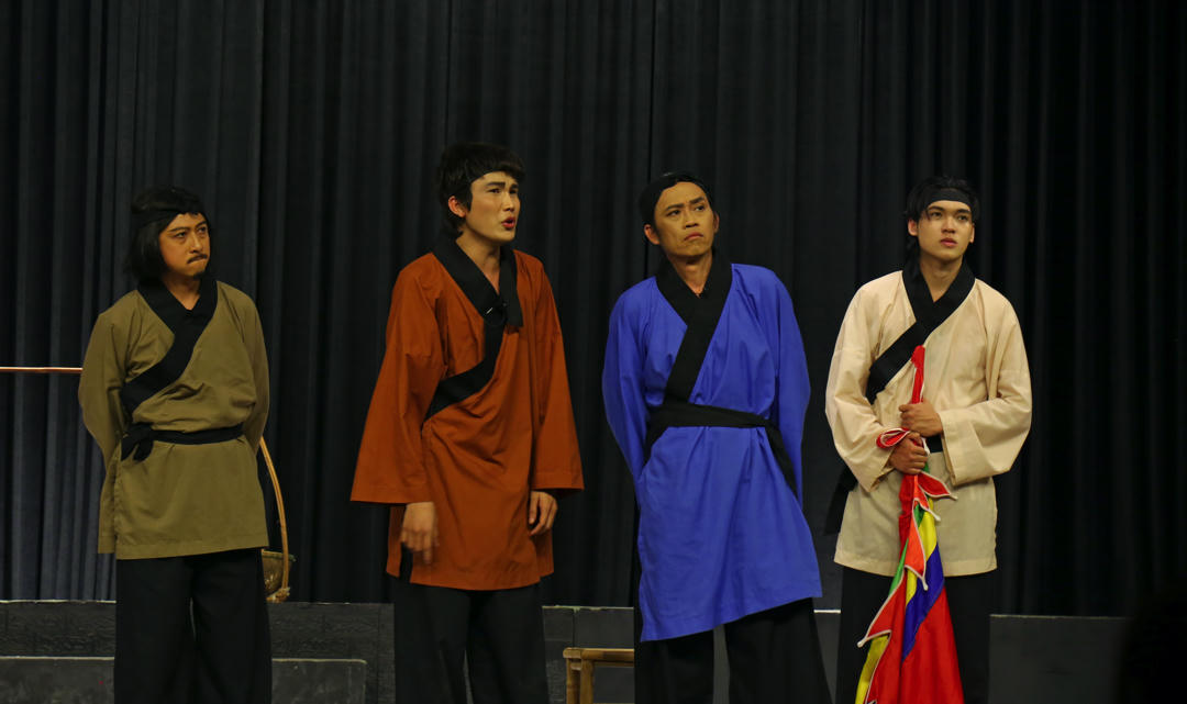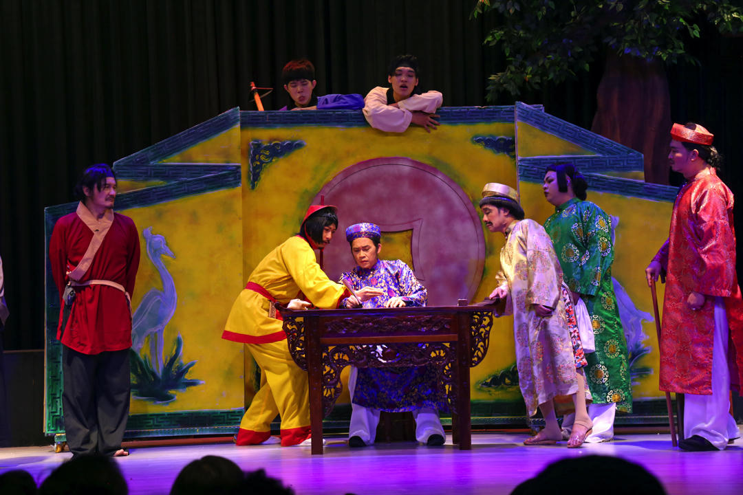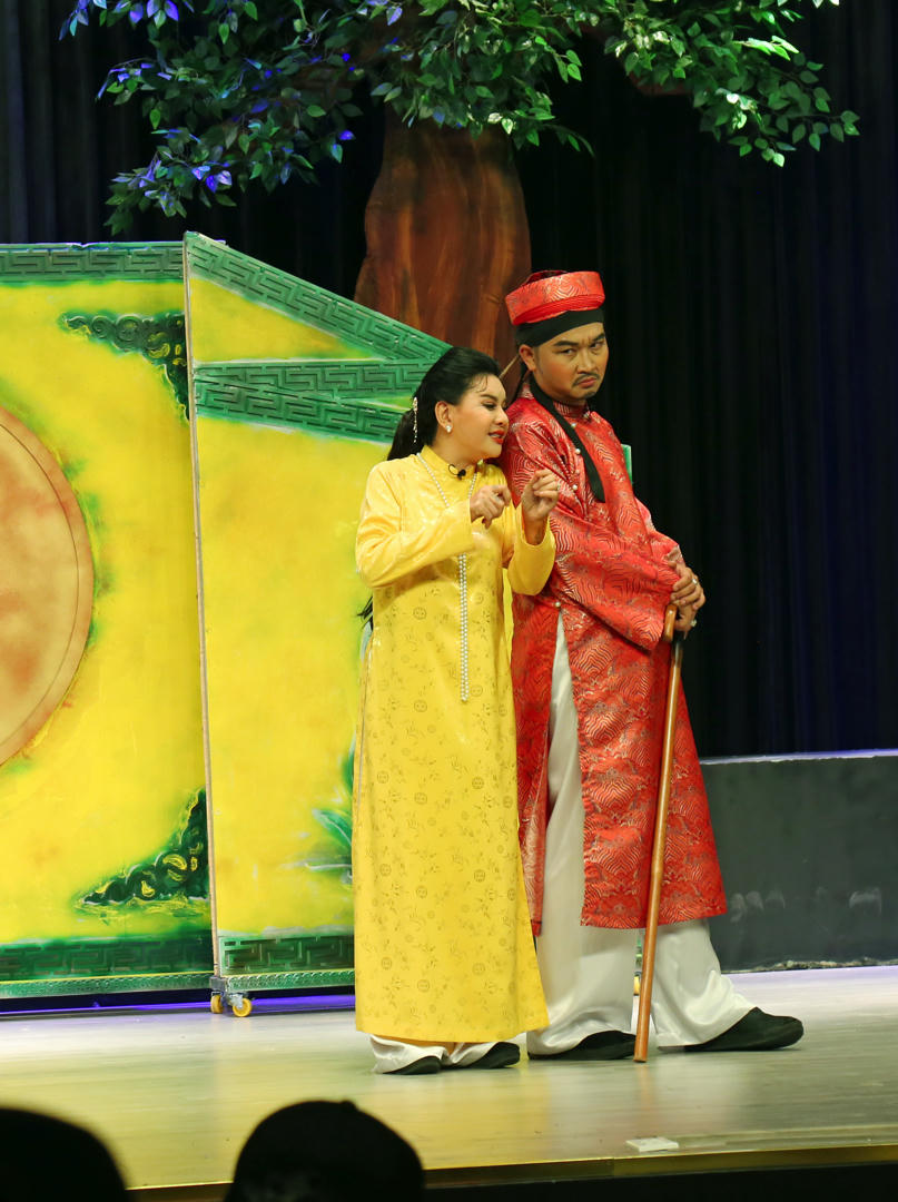 NSƯT Hoài Linh (áo xanh) trong vở diễn mới. |