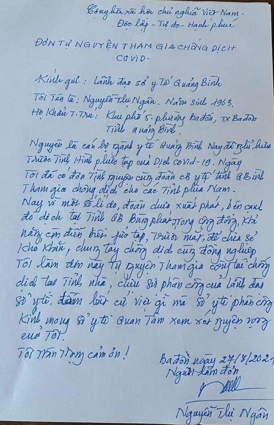 Bà Đỗ Thị Kim Quy, Trưởng phòng Tổ chức cán bộ Sở Y tế Quảng Bình cho biết, bà Ngân đã gửi đơn tình nguyện cùng đoàn cán bộ y tế tỉnh Quảng Bình tham gia vào chống dịch tại TP HCM và các tỉnh phía Nam. Tuy nhiên, vì một số lý do mà đến nay đoàn chưa thể xuất phát. Mấy ngày gần đây, Quảng Bình xuất hiện nhiều ổ dịch mới ngoài cộng đồng, tốc độ lây lan nhanh, nguy hiểm. Trước mắt, ngày 27/8, bà Ngân làm đơn tự nguyện tham gia công tác chống dịch tại tỉnh nhà, chịu sự phân công của lãnh đạo Sở Y tế, làm bất cứ việc gì mà Sở Y tế phân công.