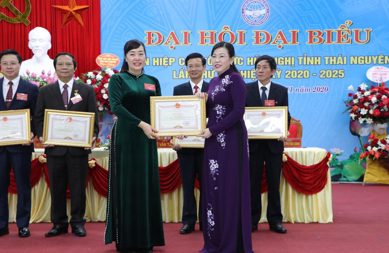 Chị Đặng Thị Kim Oanh nhận bằng khen từ Ủy viên BCH Trung ương Đảng, Bí thư Tỉnh ủy Nguyễn Thanh Hải, Trưởng Đoàn đại biểu Quốc hội tỉnh Thái Nguyên. |