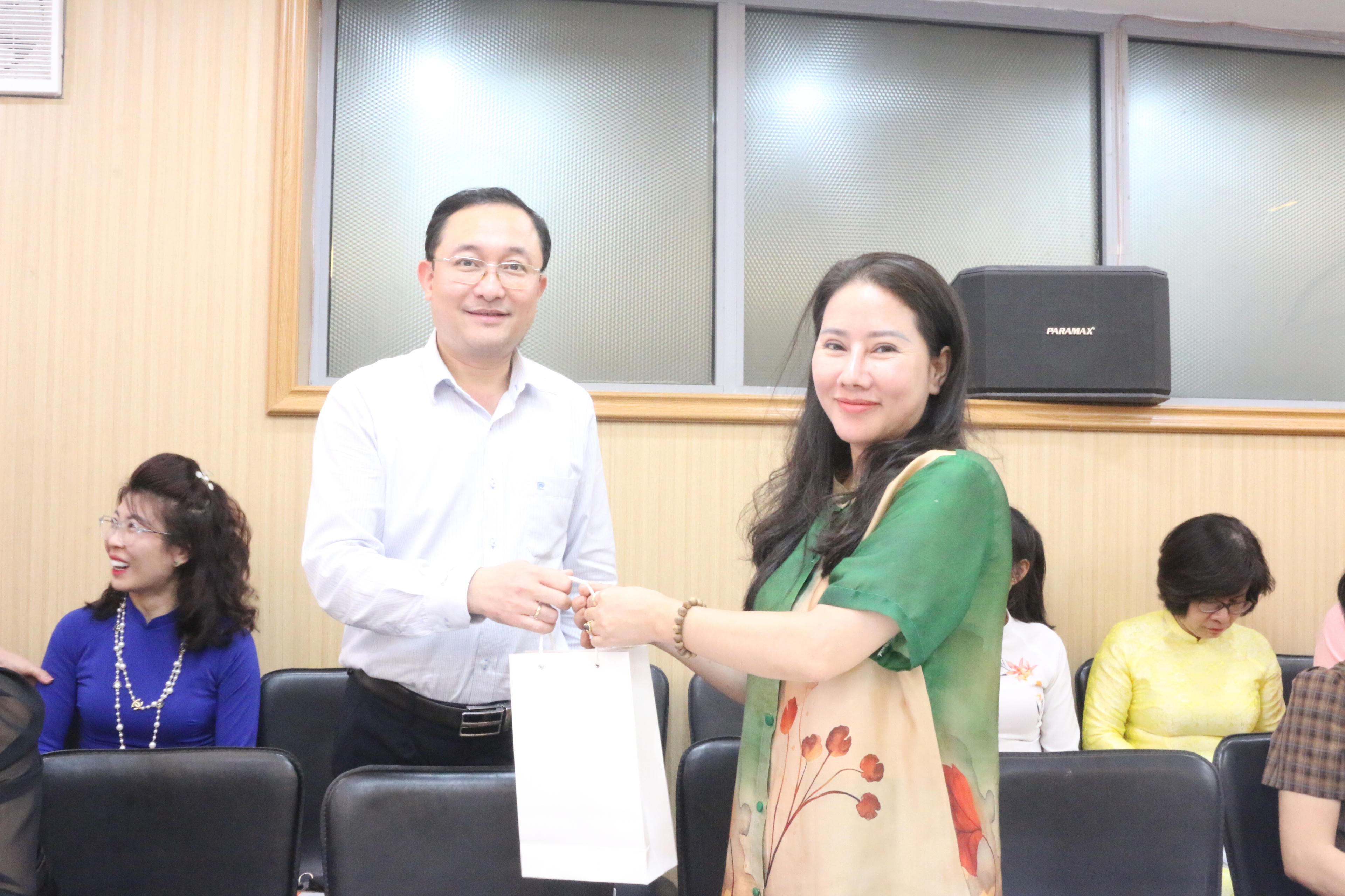 Ông Phan Hồng Nguyên Phó Chủ tịch Công đoàn Bộ và ông Hà Ánh Bình, Phó Tổng biên tập Báo Pháp luật Việt Nam, Phó Chủ tịch Công đoàn Bộ tặng quà cho các công chức, viên chức nữ Bộ Tư pháp. |