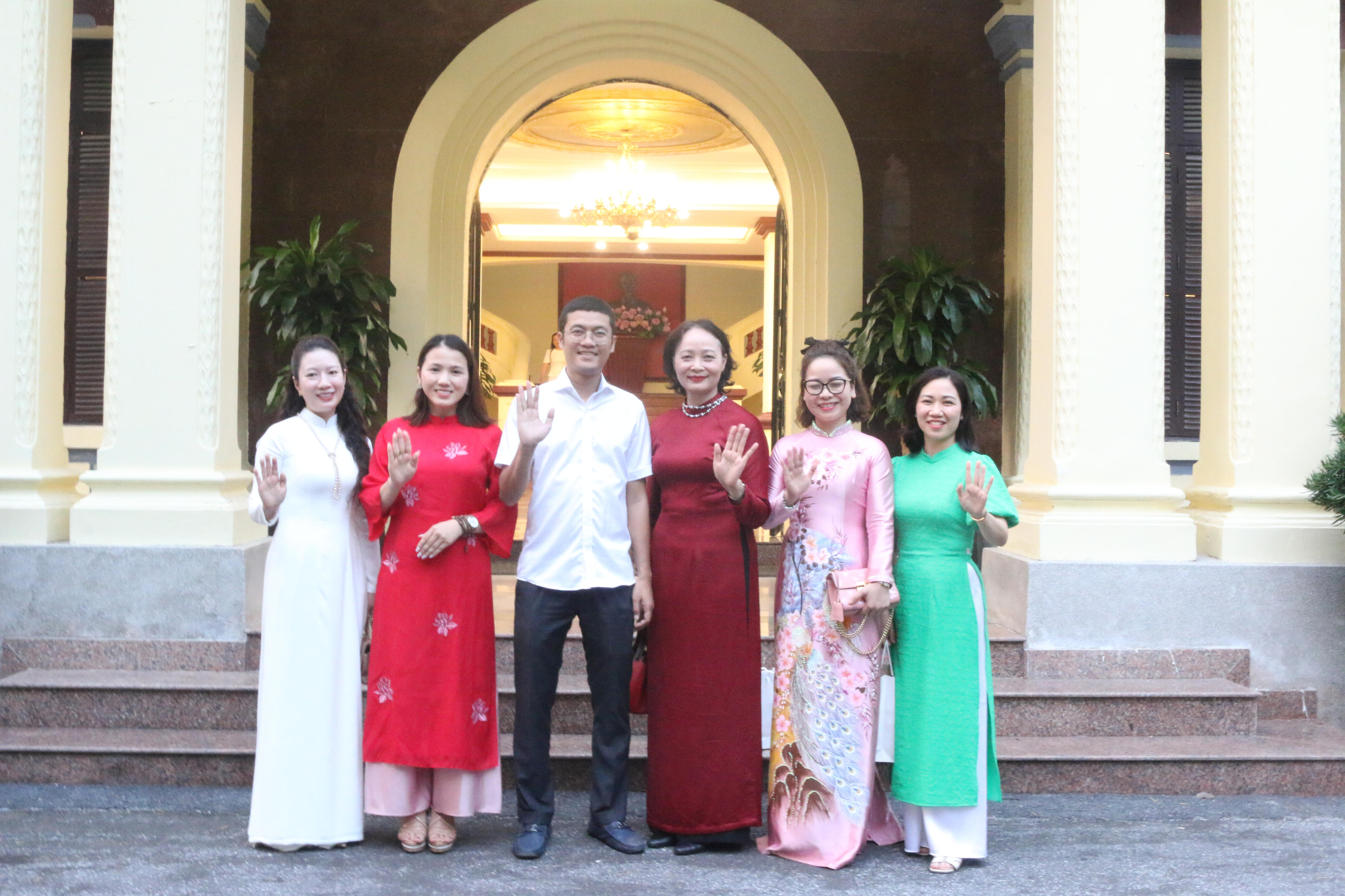 Chủ tịch Công đoàn - bà Khương Thị Thanh Huyền và Phó Chủ tịch Công đoàn - ông Hà Ánh Bình chụp ảnh lưu niệm cùng các công chức, viên chức nữ Bộ Tư pháp. |