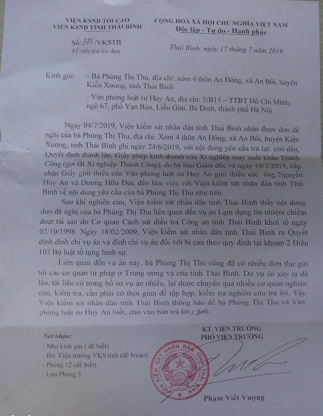 Sau khi bà Thu liên tục có đơn thư đòi hỏi quyền lợi chính đáng của mình, VKSND tỉnh Thái Bình mới đây đã ra Văn bản số 375/VKSTB do Phó Viện trưởng Phạm Viết Vượng ký trả lời yêu cầu.