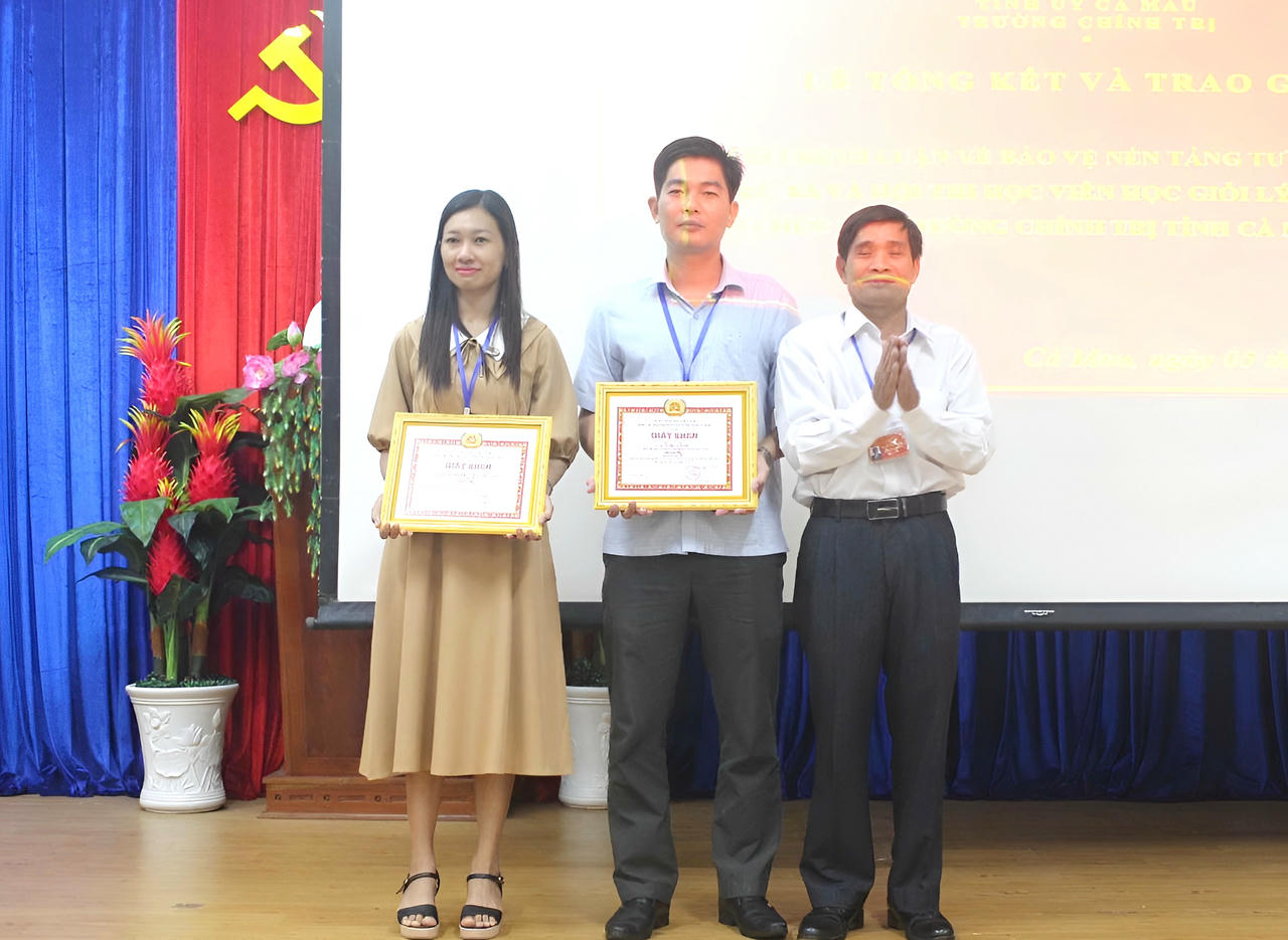 Ông Đỗ Thanh Hiệp - Phó Hiệu trưởng trường Chính trị Cà Mau, trao giải Ba cho tác giả Hữu Kim Ly trong cuộc thi viết chính luận bảo vệ nền tảng tư tưởng của Đảng |