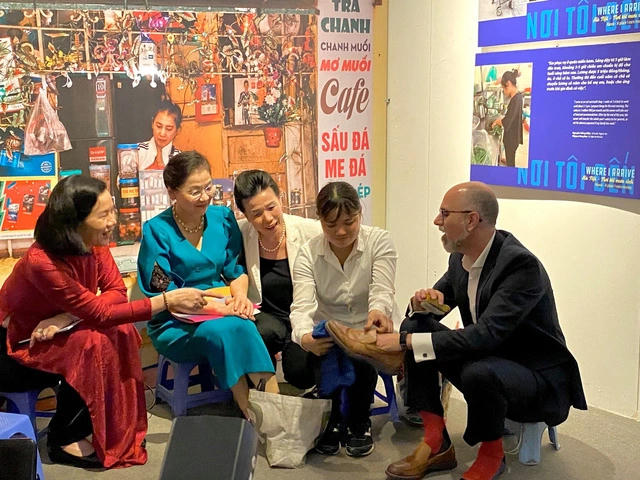 Khách dự triển lãm giao lưu cùng chị Đỗ Thị Tươi (áo trắng thứ 2 từ phải sang, lao động di cư, làm nghề đánh giày, là nhân vật có câu chuyện xuất hiện trong triển lãm. (Ảnh VTV) |